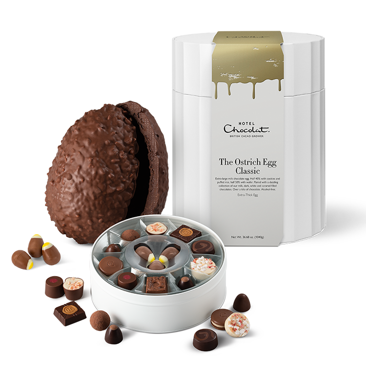Oversized and overweight, at 2lb this monolith owns the spotlight. Our Ostrich Egg is cast in texture-packed chocolate and paired with 20 luxury truffles, pralines, caramels, and patisserie chocolates.